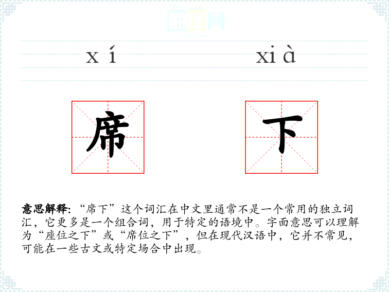 “席下”这个词汇在中文里通常不是一个常用的独立词汇,它更多是一个组合词,用于特定的语境中。字面意思可以理解为“座位之下”或“席位之下”,但在现代汉语中,它并不常见,可能在一些古文或特定场合中出现。