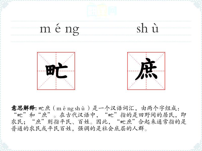 - 同义词:平民、百姓、庶民。这些词汇都指代社会底层的人群,但“甿庶”更强调农民的身份。