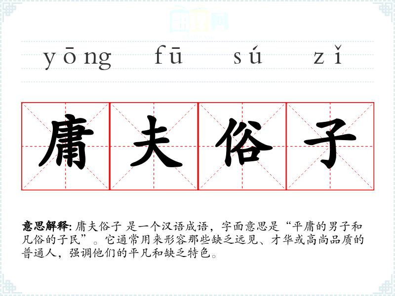 庸夫俗子 是一个汉语成语,字面意思是“平庸的男子和凡俗的子民”。它通常用来形容那些缺乏远见、才华或高尚品质的普通人,强调他们的平凡和缺乏特色。
