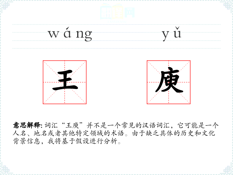 词汇“王庾”并不是一个常见的汉语词汇,它可能是一个人名、地名或者其他特定领域的术语。由于缺乏具体的历史和文化背景信息,我将基于假设进行分析。
