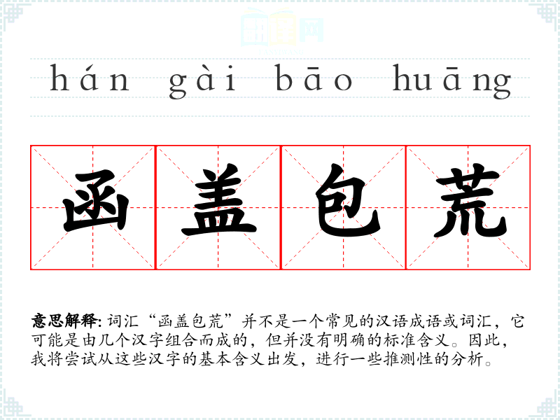 词汇“函盖包荒”并不是一个常见的汉语成语或词汇,它可能是由几个汉字组合而成的,但并没有明确的标准含义。因此,我将尝试从这些汉字的基本含义出发,进行一些推测性的分析。