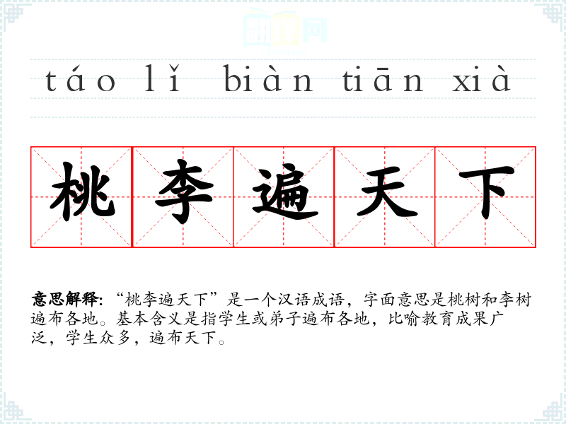 “桃李遍天下”是一个汉语成语,字面意思是桃树和李树遍布各地。基本含义是指学生或弟子遍布各地,比喻教育成果广泛,学生众多,遍布天下。