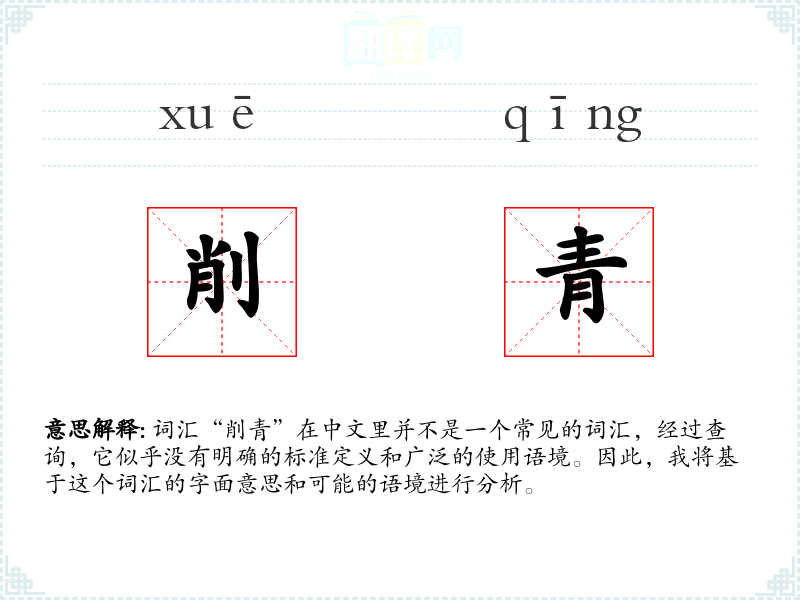 词汇“削青”在中文里并不是一个常见的词汇,经过查询,它似乎没有明确的标准定义和广泛的使用语境。因此,我将基于这个词汇的字面意思和可能的语境进行分析。