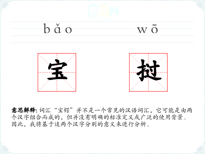 词汇“宝锷”并不是一个常见的汉语词汇,它可能是由两个汉字组合而成的,但并没有明确的标准定义或广泛的使用背景。因此,我将基于这两个汉字分别的意义来进行分析。