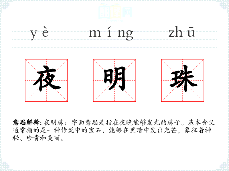 夜明珠:字面意思是指在夜晚能够发光的珠子。基本含义通常指的是一种传说中的宝石,能够在黑暗中发出光芒,象征着神秘、珍贵和美丽。