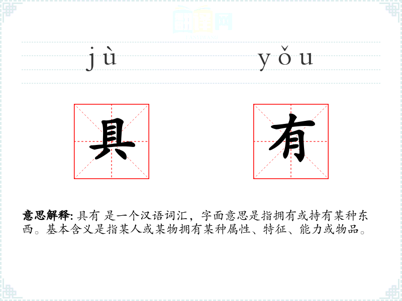 具有 是一个汉语词汇,字面意思是指拥有或持有某种东西。基本含义是指某人或某物拥有某种属性、特征、能力或物品。