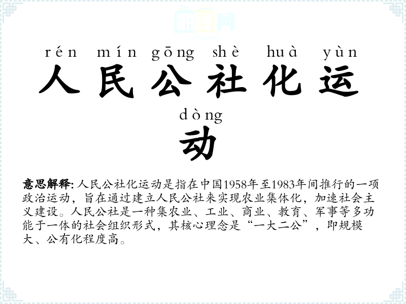 - 专业领域:在历史学、政治学和社会学等领域,人民公社化是一个重要的研究对象,用于分析集体化的影响和后果。