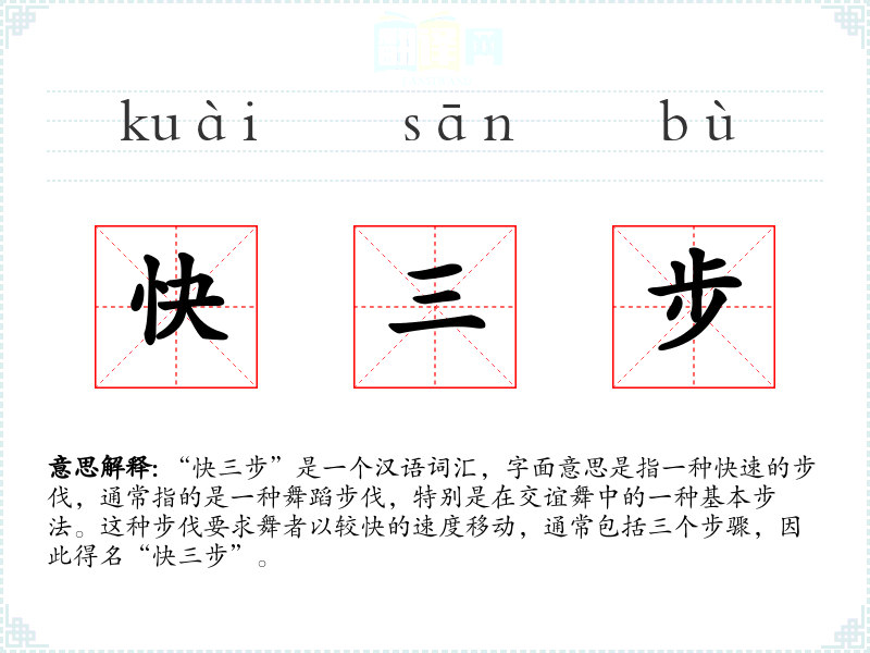“快三步”是一个汉语词汇,字面意思是指一种快速的步伐,通常指的是一种舞蹈步伐,特别是在交谊舞中的一种基本步法。这种步伐要求舞者以较快的速度移动,通常包括三个步骤,因此得名“快三步”。