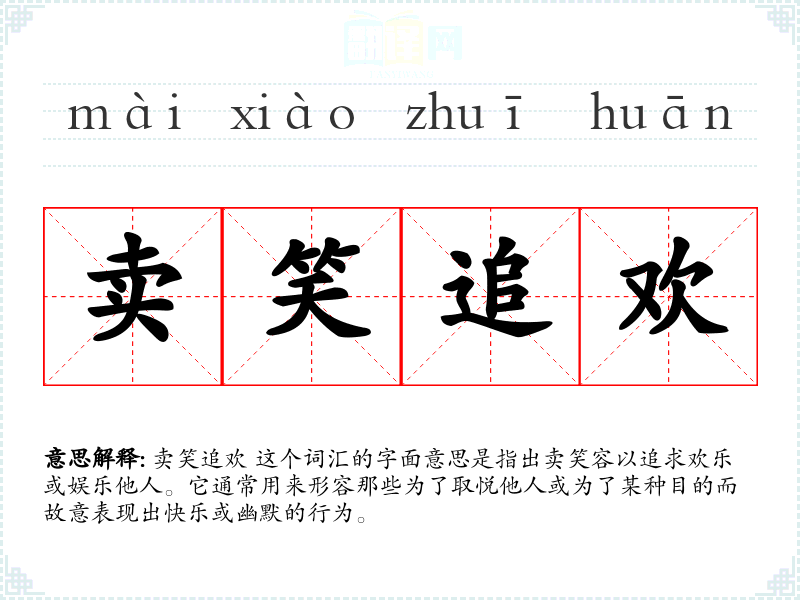 卖笑追欢 这个词汇的字面意思是指出卖笑容以追求欢乐或娱乐他人。它通常用来形容那些为了取悦他人或为了某种目的而故意表现出快乐或幽默的行为。