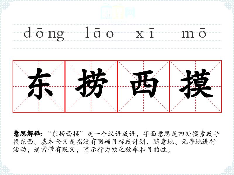 “东捞西摸”是一个汉语成语,字面意思是四处摸索或寻找东西。基本含义是指没有明确目标或计划,随意地、无序地进行活动,通常带有贬义,暗示行为缺乏效率和目的性。