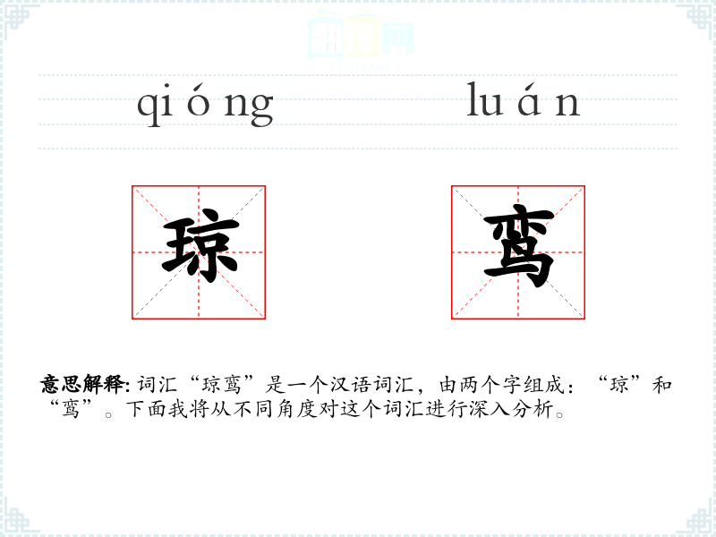词汇“琼鸾”是一个汉语词汇,由两个字组成:“琼”和“鸾”。下面我将从不同角度对这个词汇进行深入分析。