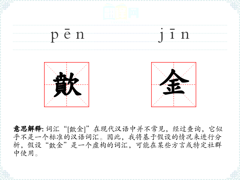 词汇“[歕金]”在现代汉语中并不常见,经过查询,它似乎不是一个标准的汉语词汇。因此,我将基于假设的情况来进行分析,假设“歕金”是一个虚构的词汇,可能在某些方言或特定社群中使用。