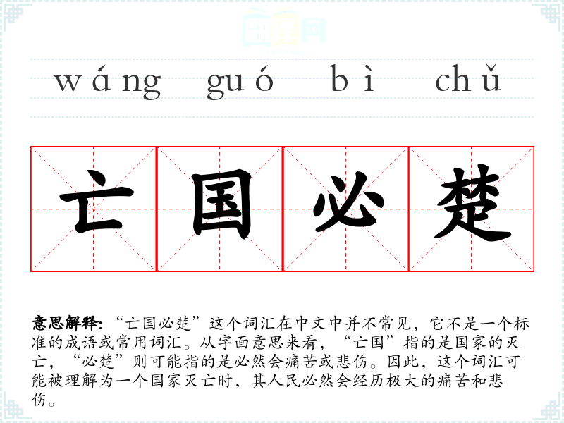 “亡国必楚”这个词汇在中文中并不常见,它不是一个标准的成语或常用词汇。从字面意思来看,“亡国”指的是国家的灭亡,“必楚”则可能指的是必然会痛苦或悲伤。因此,这个词汇可能被理解为一个国家灭亡时,其人民必然会经历极大的痛苦和悲伤。