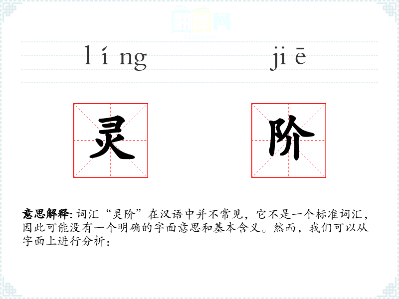 词汇“灵阶”在汉语中并不常见,它不是一个标准词汇,因此可能没有一个明确的字面意思和基本含义。然而,我们可以从字面上进行分析: