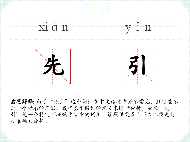 由于“先引”这个词汇在中文语境中并不常见,且可能不是一个标准的词汇,我将基于假设的定义来进行分析。如果“先引”是一个特定领域或方言中的词汇,请提供更多上下文以便进行更准确的分析。