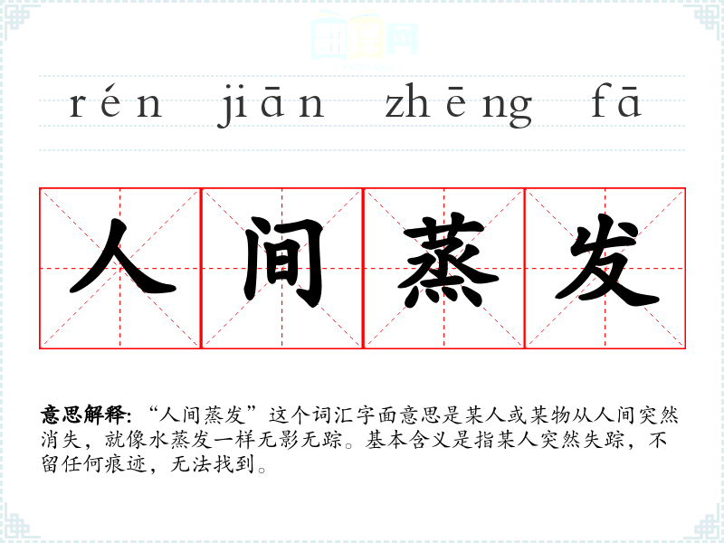 "人间蒸发"的意思解释、人间蒸发是什么意思由翻译网汉语词典查词提供。