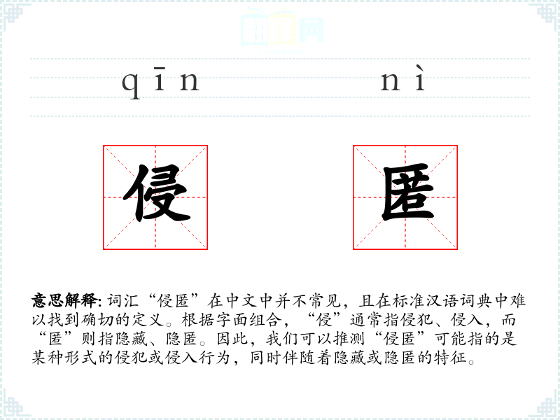 词汇“侵匿”在中文中并不常见,且在标准汉语词典中难以找到确切的定义。根据字面组合,“侵”通常指侵犯、侵入,而“匿”则指隐藏、隐匿。因此,我们可以推测“侵匿”可能指的是某种形式的侵犯或侵入行为,同时伴随着隐藏或隐匿的特征。