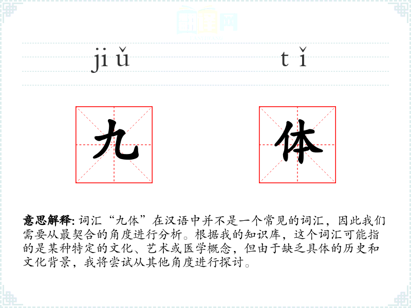 由于“九体”不是一个常见的词汇,它在文学、口语和专业领域中的使用可能非常有限。如果存在,它可能出现在特定的文化或历史文献中。