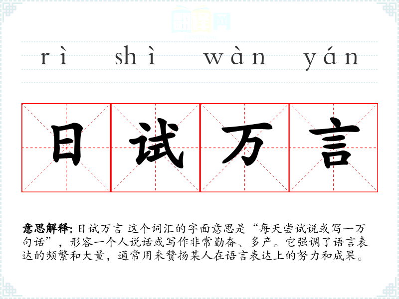 日试万言 这个词汇的字面意思是“每天尝试说或写一万句话”,形容一个人说话或写作非常勤奋、多产。它强调了语言表达的频繁和大量,通常用来赞扬某人在语言表达上的努力和成果。