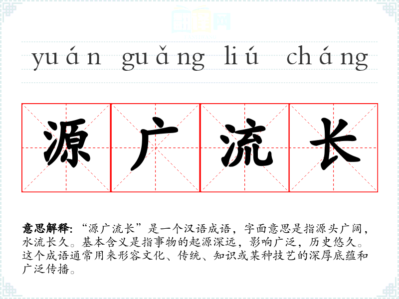 “源广流长”是一个汉语成语,字面意思是指源头广阔,水流长久。基本含义是指事物的起源深远,影响广泛,历史悠久。这个成语通常用来形容文化、传统、知识或某种技艺的深厚底蕴和广泛传播。