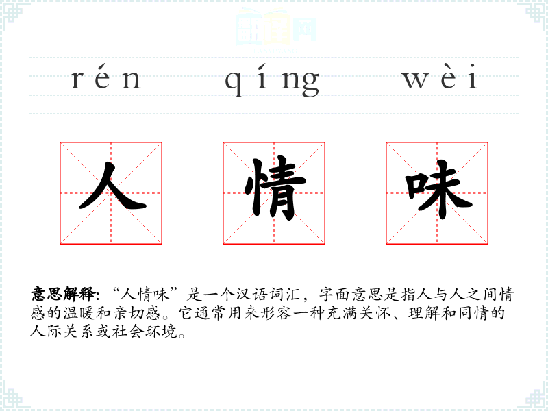 “人情味”是一个汉语词汇,字面意思是指人与人之间情感的温暖和亲切感。它通常用来形容一种充满关怀、理解和同情的人际关系或社会环境。