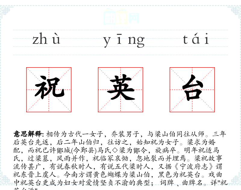 1.相传为古代一女子,乔装男子,与梁山伯同往从师。三年后英台先返,后二年山伯归,往访之,始知祝为女子。梁求为婚配,而祝已许鄮城(今鄞县)马氏◇梁为鄮令,旋病卒。明年祝适马氏,过梁墓,风雨并作,祝临冢哀恸,忽地裂而并埋焉。梁祝故事流传甚广,有说春秋时人,有说五代梁时人,又据《宁波府志》谓祝东晋上虞人。今南方谓黄色蝴蝶为梁山伯,黑色为祝英台。戏曲中祝英台更成为妇女对爱情坚贞不渝的典型; 词牌﹑曲牌名。详"祝英台近"。