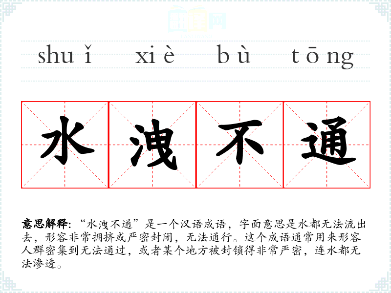 “水洩不通”是一个汉语成语,字面意思是水都无法流出去,形容非常拥挤或严密封闭,无法通行。这个成语通常用来形容人群密集到无法通过,或者某个地方被封锁得非常严密,连水都无法渗透。