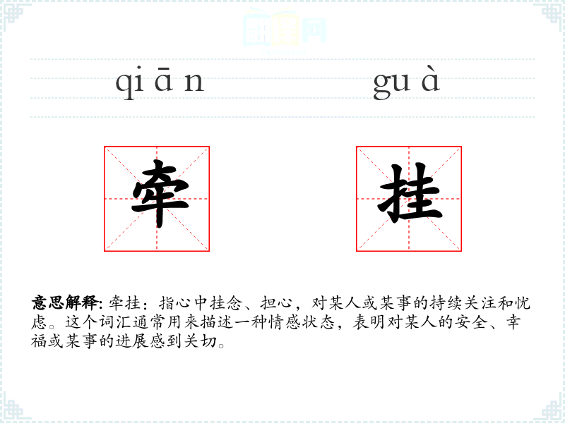 牵挂:指心中挂念、担心,对某人或某事的持续关注和忧虑。这个词汇通常用来描述一种情感状态,表明对某人的安全、幸福或某事的进展感到关切。