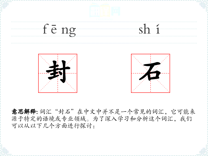 词汇“封石”在中文中并不是一个常见的词汇,它可能来源于特定的语境或专业领域。为了深入学*和分析这个词汇,我们可以从以下几个方面进行探讨: