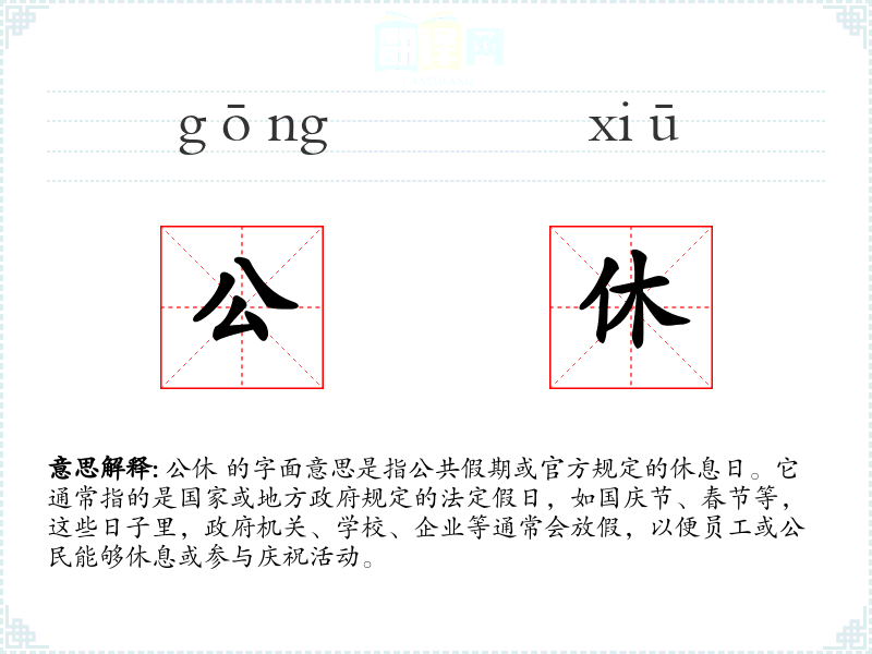 公休 这个词由“公”和“休”两个字组成。"公"字在这里指的是公共的、官方的,而"休"字则意味着休息。这个词在中文中的使用历史悠久,随着社会的发展,公休日的种类和数量也在不断变化。