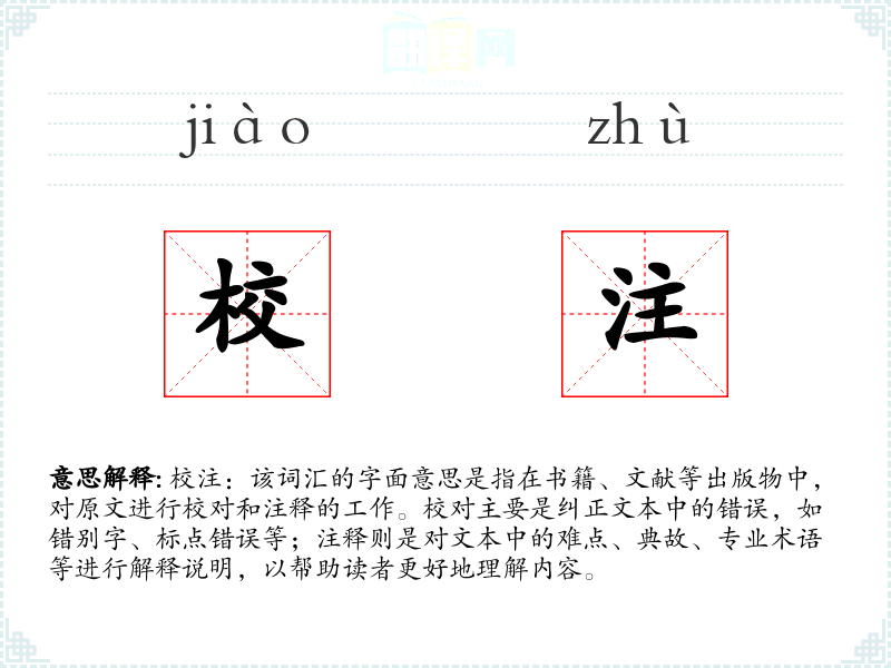 校注:该词汇的字面意思是指在书籍、文献等出版物中,对原文进行校对和注释的工作。校对主要是纠正文本中的错误,如错别字、标点错误等;注释则是对文本中的难点、典故、专业术语等进行解释说明,以帮助读者更好地理解内容。
