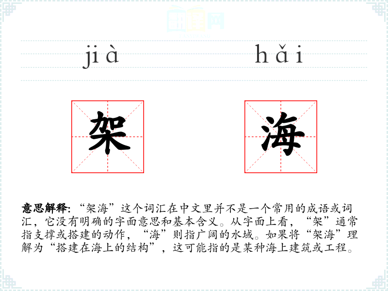 “架海”这个词汇在中文里并不是一个常用的成语或词汇,它没有明确的字面意思和基本含义。从字面上看,“架”通常指支撑或搭建的动作,“海”则指广阔的水域。如果将“架海”理解为“搭建在海上的结构”,这可能指的是某种海上建筑或工程。