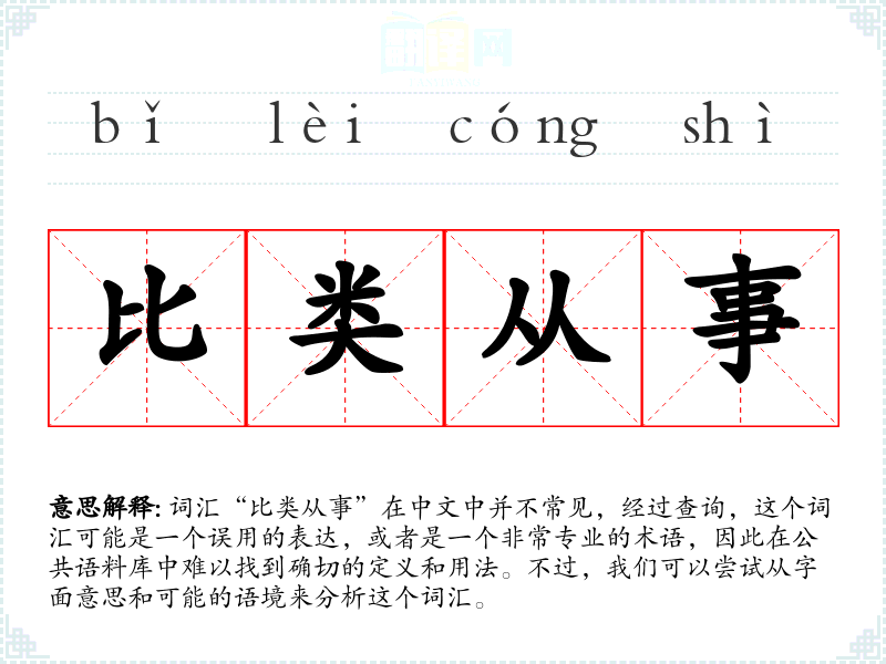 词汇“比类从事”在中文中并不常见,经过查询,这个词汇可能是一个误用的表达,或者是一个非常专业的术语,因此在公共语料库中难以找到确切的定义和用法。不过,我们可以尝试从字面意思和可能的语境来分析这个词汇。