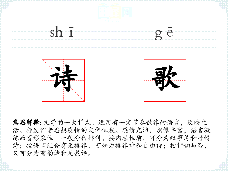 1.文学的一大样式。运用有一定节奏韵律的语言,反映生活、抒发作者思想感情的文学体裁。感情充沛,想像丰富,语言凝练而富形象性。一般分行排列。按内容性质,可分为叙事诗和抒情诗;按语言组合有无格律,可分为格律诗和自由诗;按押韵与否,又可分为有韵诗和无韵诗。