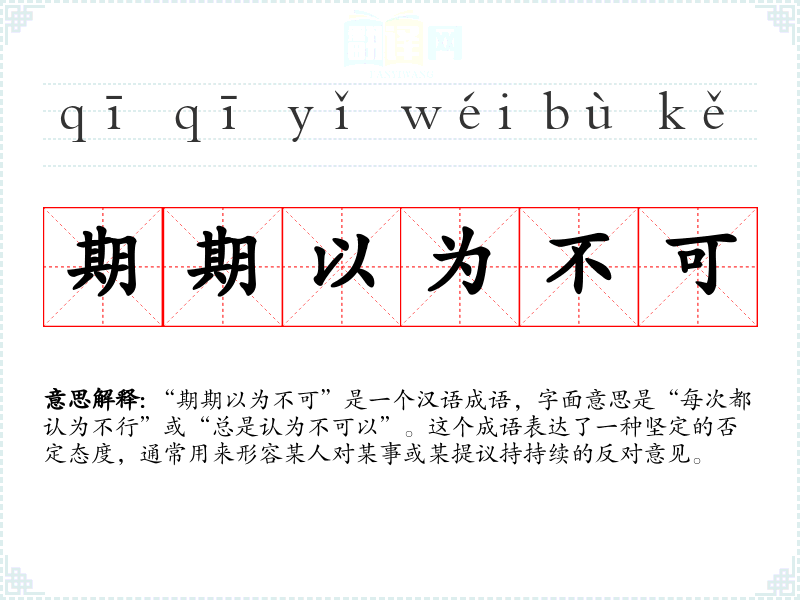“期期以为不可”是一个汉语成语,字面意思是“每次都认为不行”或“总是认为不可以”。这个成语表达了一种坚定的否定态度,通常用来形容某人对某事或某提议持持续的反对意见。