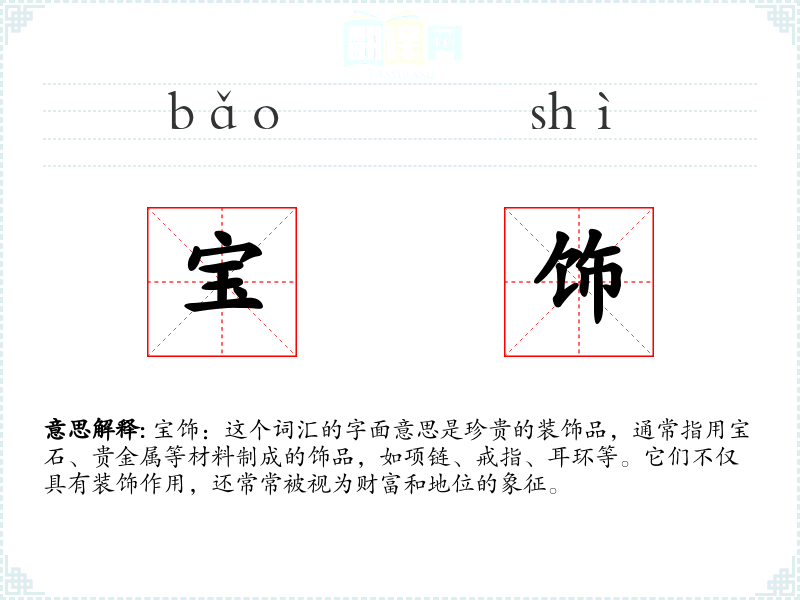 宝饰:这个词汇的字面意思是珍贵的装饰品,通常指用宝石、贵金属等材料制成的饰品,如项链、戒指、耳环等。它们不仅具有装饰作用,还常常被视为财富和地位的象征。