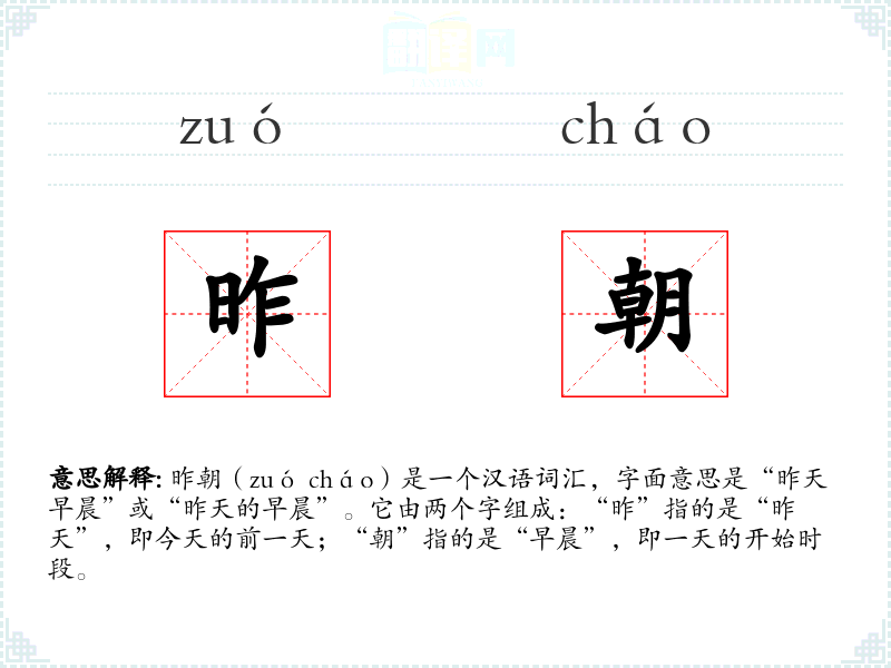 昨朝(zuó cháo)是一个汉语词汇,字面意思是“昨天早晨”或“昨天的早晨”。它由两个字组成:“昨”指的是“昨天”,即今天的前一天;“朝”指的是“早晨”,即一天的开始时段。