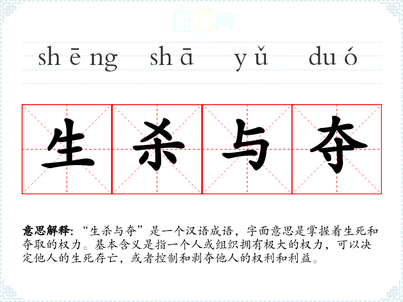 “生杀与夺”是一个汉语成语,字面意思是掌握着生死和夺取的权力。基本含义是指一个人或组织拥有极大的权力,可以决定他人的生死存亡,或者控制和剥夺他人的权利和利益。