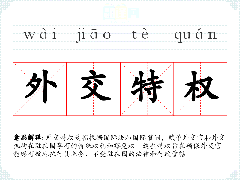 同义词:外交豁免权、外交优惠、外交待遇 反义词:无特权、普通待遇、无豁免