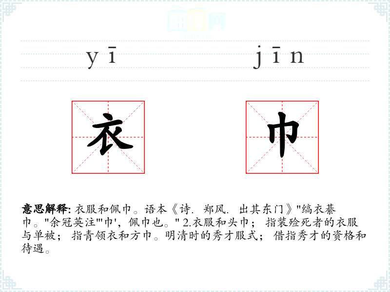 衣服和佩巾。语本《诗.郑风.出其东门》"缟衣綦巾。"余冠英注"'巾',佩巾也。" 2.衣服和头巾; 指装殓死者的衣服与单被; 指青领衣和方巾。明清时的秀才服式; 借指秀才的资格和待遇。