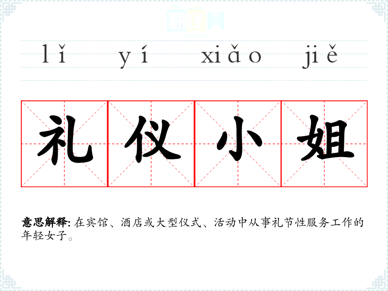 在宾馆、酒店或大型仪式、活动中从事礼节性服务工作的年轻女子。