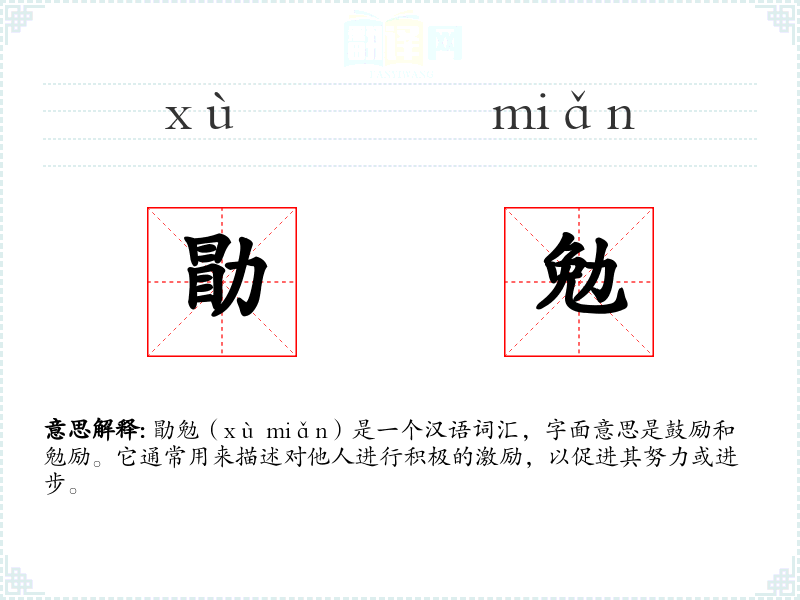 勖勉(xù miǎn)是一个汉语词汇,字面意思是鼓励和勉励。它通常用来描述对他人进行积极的激励,以促进其努力或进步。