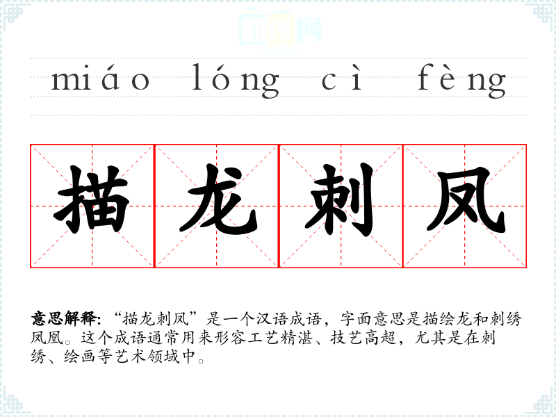 “描龙刺凤”是一个汉语成语,字面意思是描绘龙和刺绣凤凰。这个成语通常用来形容工艺精湛、技艺高超,尤其是在刺绣、绘画等艺术领域中。