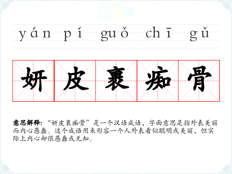 “妍皮裹痴骨”是一个汉语成语,字面意思是指外表美丽而内心愚蠢。这个成语用来形容一个人外表看似聪明或美丽,但实际上内心却很愚蠢或无知。