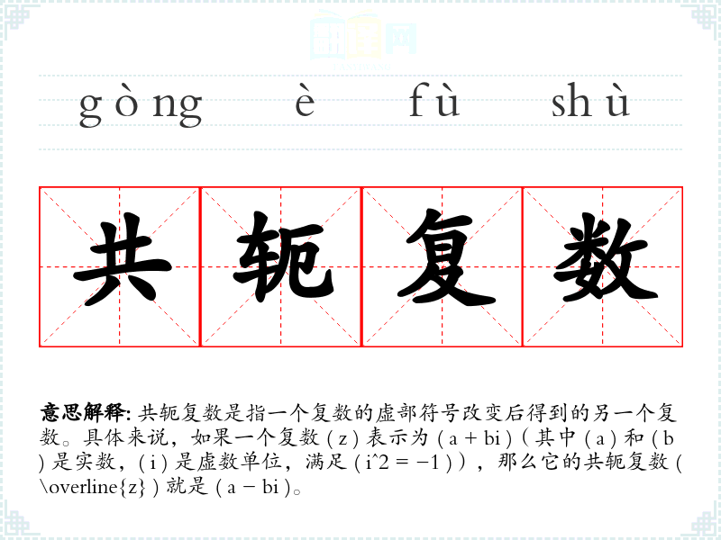 - 反义词:无直接反义词,但可以考虑“非共轭复数”作为对比。