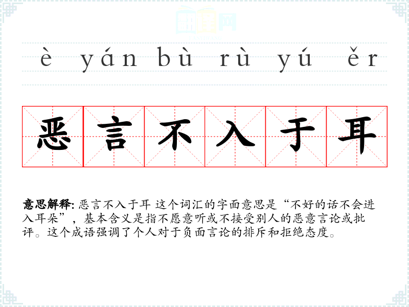 恶言不入于耳 这个词汇的字面意思是“不好的话不会进入耳朵”,基本含义是指不愿意听或不接受别人的恶意言论或批评。这个成语强调了个人对于负面言论的排斥和拒绝态度。