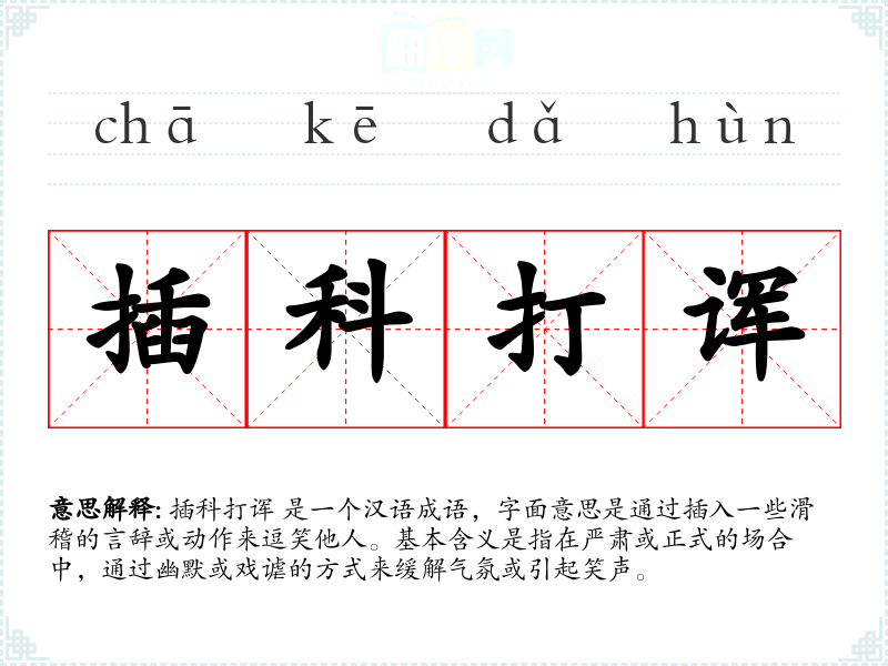 插科打诨 是一个汉语成语,字面意思是通过插入一些滑稽的言辞或动作来逗笑他人。基本含义是指在严肃或正式的场合中,通过幽默或戏谑的方式来缓解气氛或引起笑声。