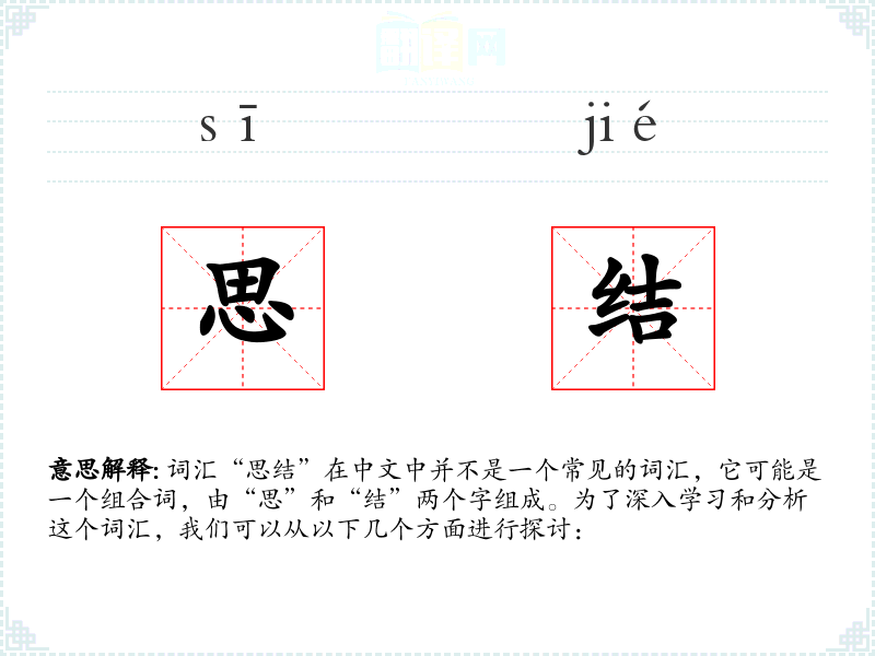 词汇“思结”在中文中并不是一个常见的词汇,它可能是一个组合词,由“思”和“结”两个字组成。为了深入学习和分析这个词汇,我们可以从以下几个方面进行探讨: