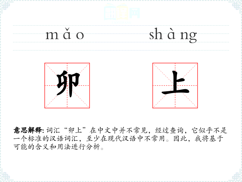 由于“卯上”不是一个标准词汇,我们无法给出一个确切的字面意思和基本含义。但根据字面组合,“卯”通常指十二地支之一,与时间、方位有关;“上”则有上升、增加的含义。结合起来,可能指的是某种时间上的开始或增加。