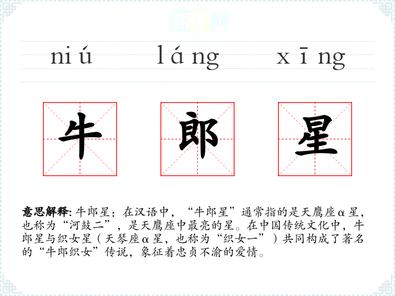 - 反义词:织女星(在爱情传说中,织女星与牛郎星相对,象征着分离与重逢)